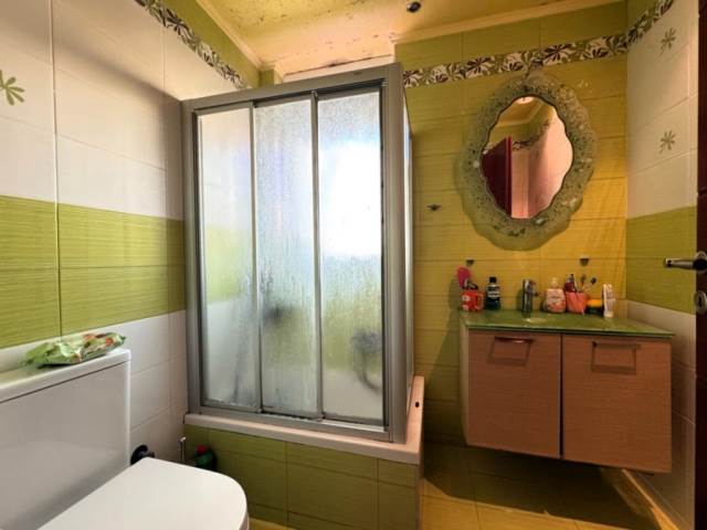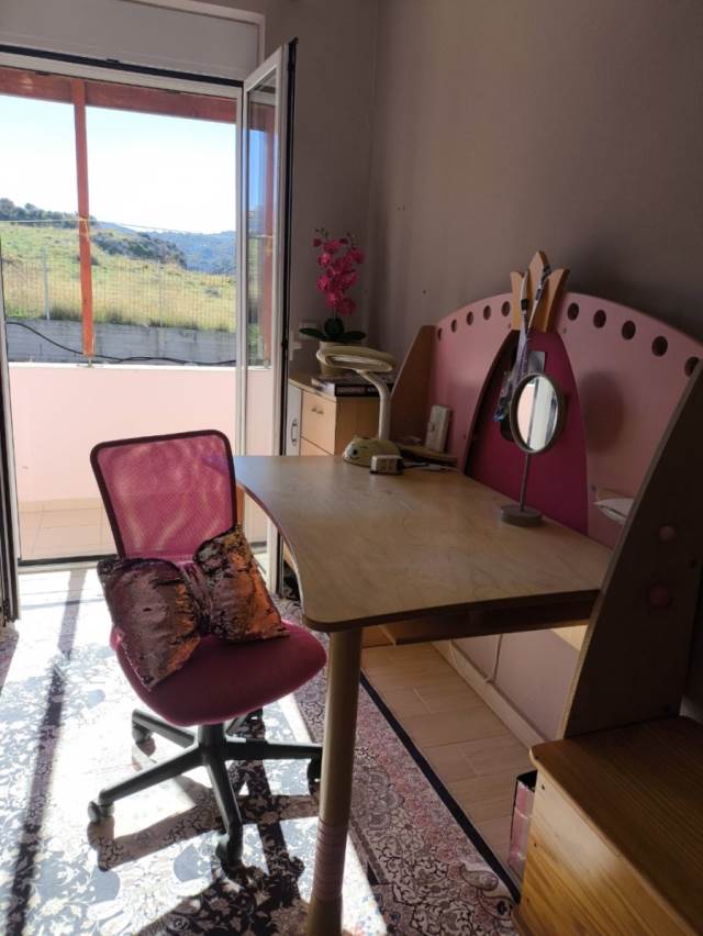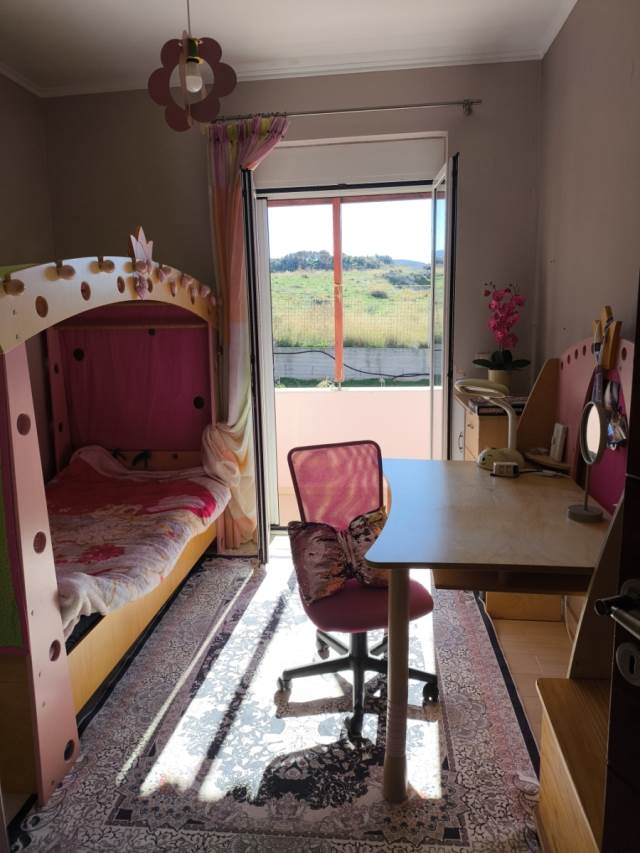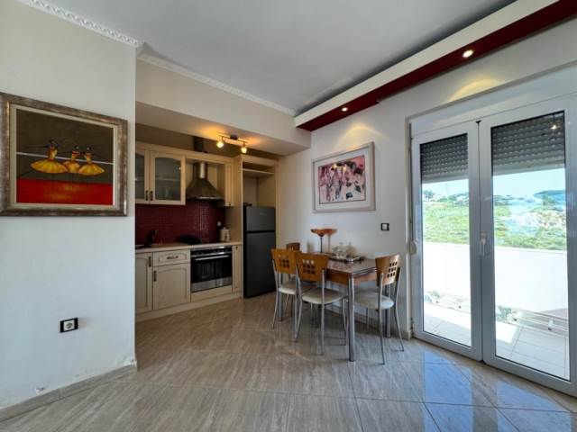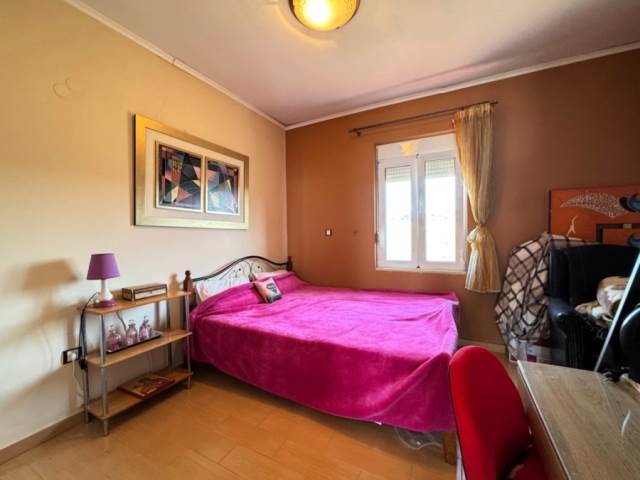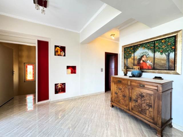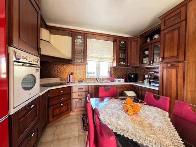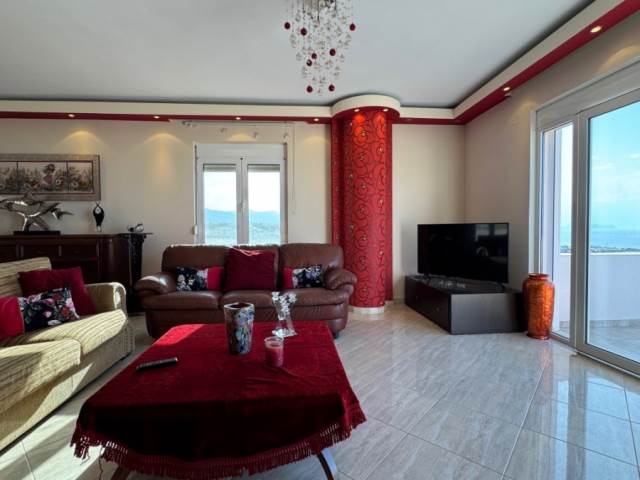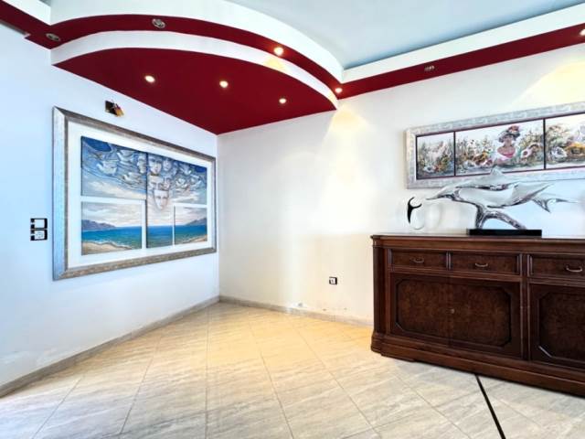Le premier étage fait 120 m² et se compose d'un petit espace de réception avec un petit débarras à côté, d'un grand salon ouvert avec cheminée et cuisine, de 3 chambres dont une avec placard, de deux salles de bains, de balcons à l'arrière et d'une grande terrasse à l'avant avec vue sur la mer. Le sol est chauffé au sol.
